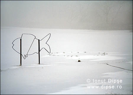 iazul inghetat..urma unei copci…silueta grosolana a unui peste din fierforjat…ceatza deasa din padure…efectiv…peisaj de basm…astepti sa apara sipestisorul de aur din poveste si asta e totu!